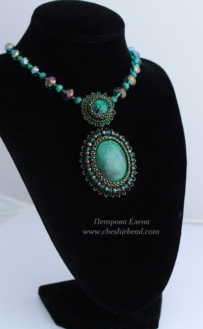 натуральный малахит, бусины из натурального малахита, риволи сваровски, стекло, бисер, кожа