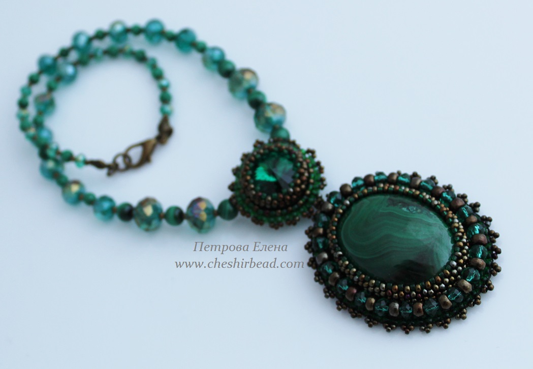 натуральный малахит, бусины из натурального малахита, риволи сваровски, стекло, бисер, кожа